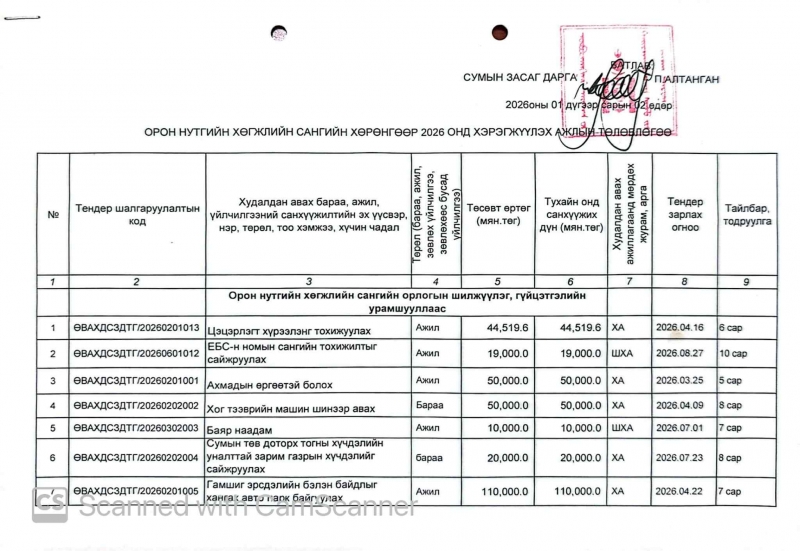 Орон нутгийн хөгжлийн сангийн хөрөнгөөр 2026 онд хэрэгжүүлэх ажлын төлөвлөгөө
