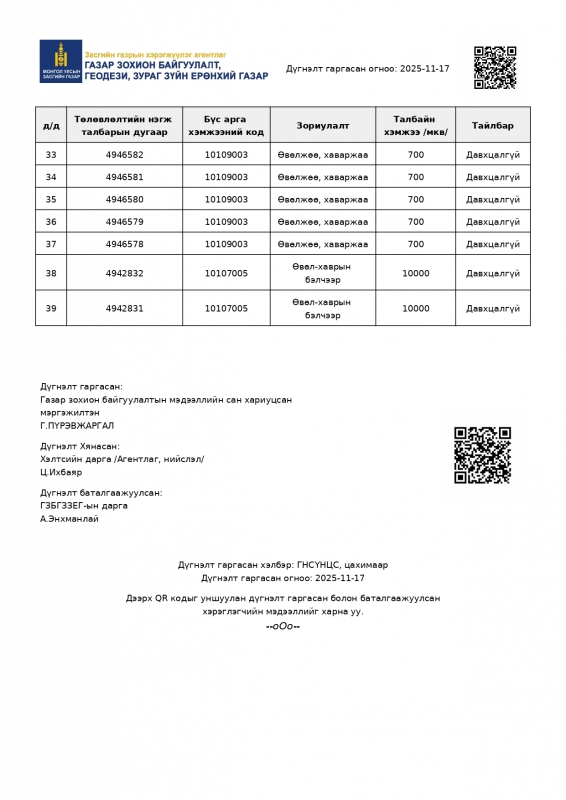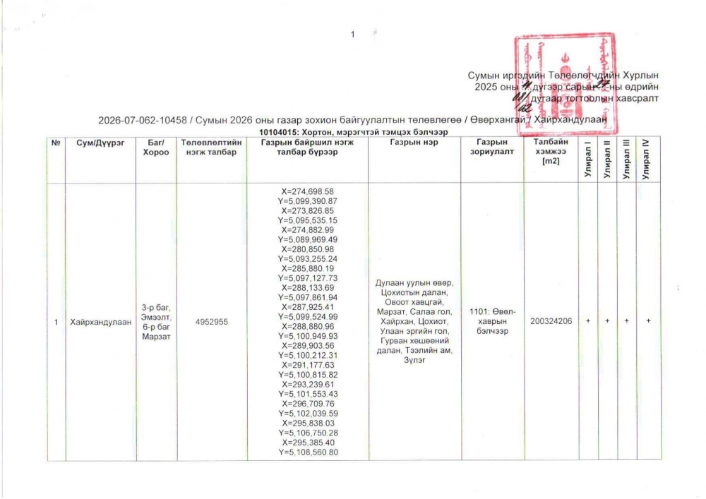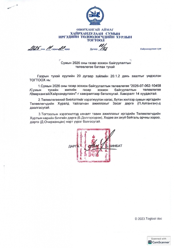 Сумын ИТХ-ын 2025 оны 11 дүгээр сарын 27-ны өдрийн 08/02 дугаар тогтоолоор сумын 2026 оны газар зохион байгуулалтын төлөвлөгөөг баталсан.