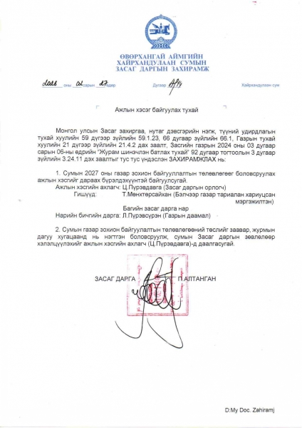 Сумын 2027 оны газар зохион байгуулалтын төлөвлөгөө боловсруулах ажлын хэсэг сумын Засаг даргын захирамжаар байгуулагдлаа